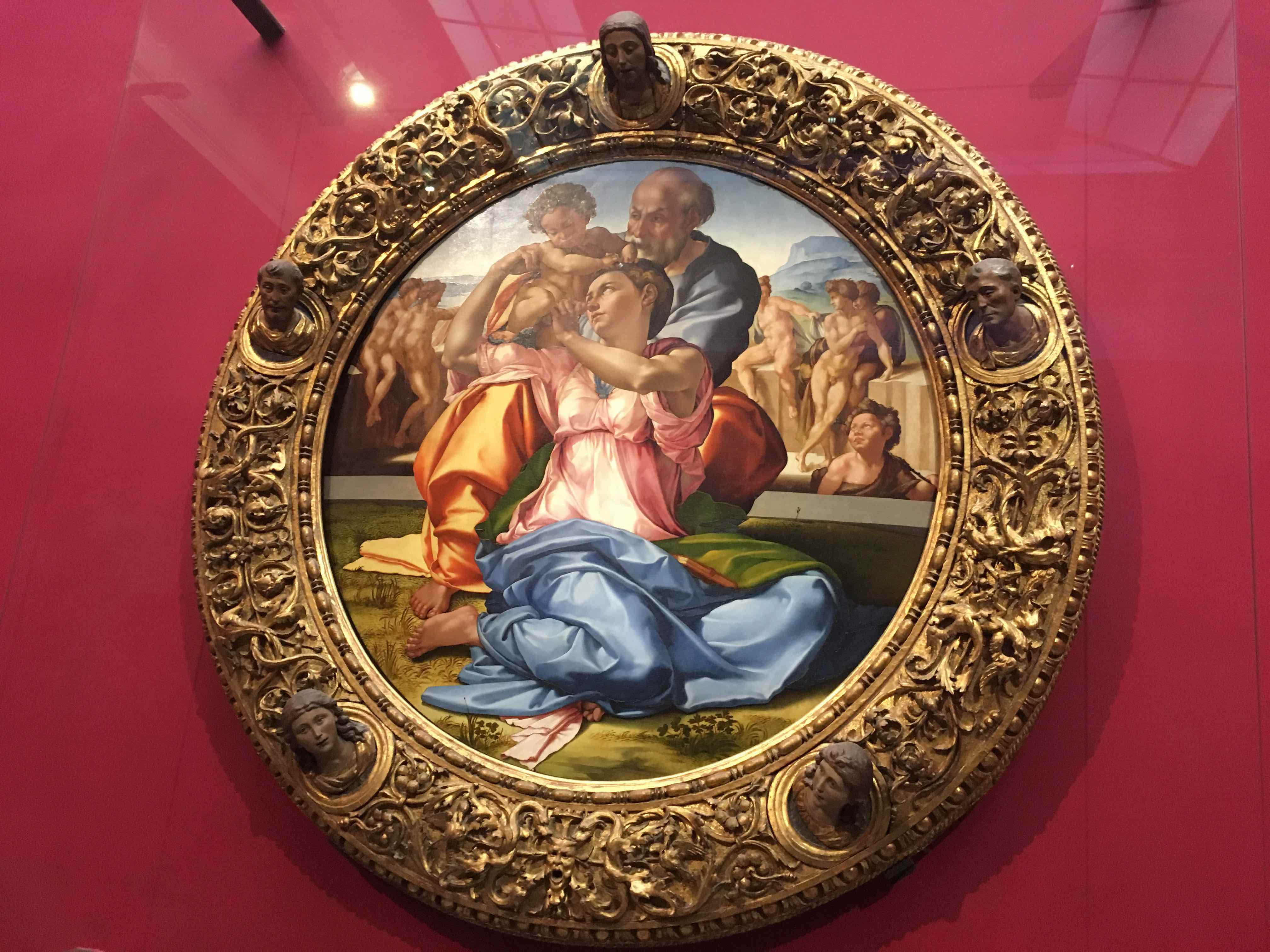 미켈란젤로(Michelangelo Buonarroti, 1475-1564)의 "성 가족(Sacra Famiglia / Tondo Doni, 1503-1504)"이다. 피렌체 스트로치가의 딸의 출산을 기념해서 미켈란젤로가 그리고, 액자도 직접 디자인했다. 인물이 굉장히 역동적이며 색채가 너무 선명하고, 푸른색 안료가 인상적이다.