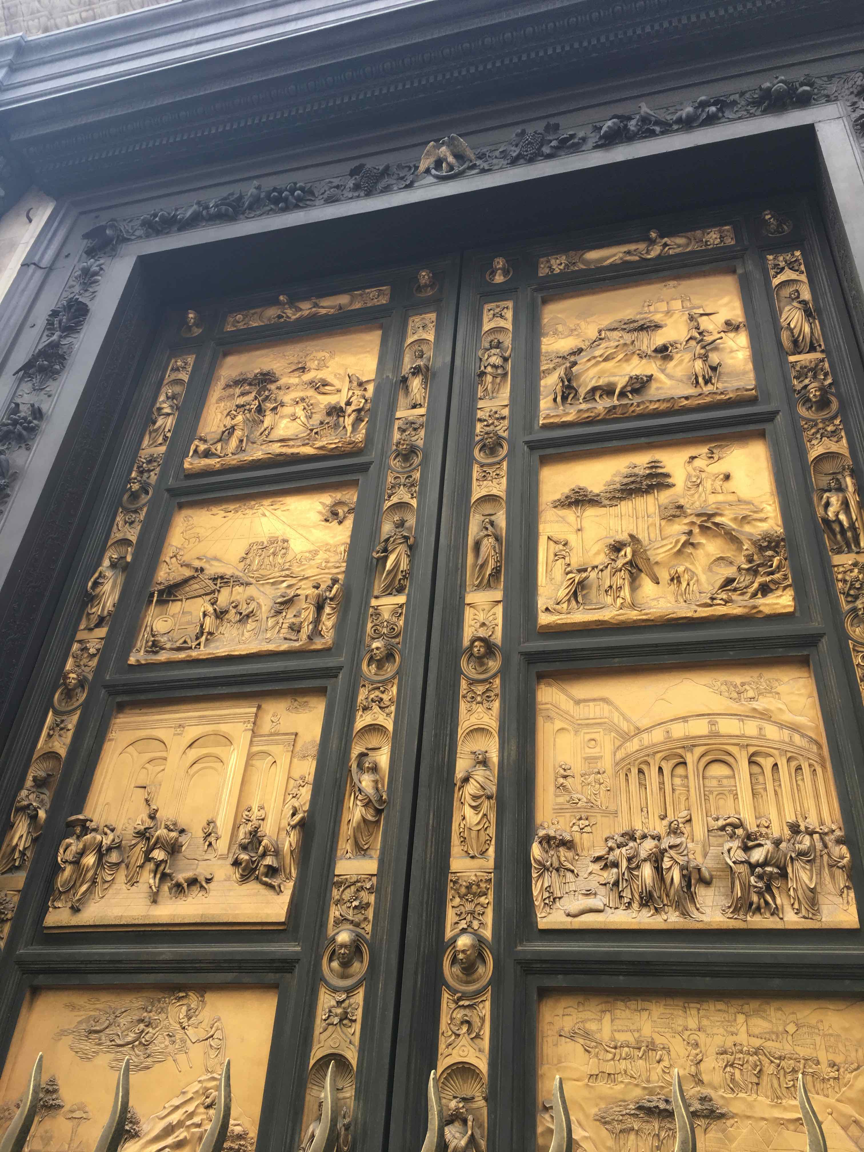 "산 조반니 세례당(Battistero di San Giovanni)"은 피렌체에서 가장 오래된 종교 건축물로 1059년에서 1128년 사이에 로마네스크 양식으로 건립됐다. 산 조반니 세례당으로 들어가는 문은 세 개가 있는데, 각각 성경의 주요 장면으로 장식했다. 남쪽문은 "안드레아 피사노(Andrea Pisano)"가 만들었는데 "세례자 요한(Giovanni Battista)"의 삶을 보여준다. 북쪽과 동쪽문은 "로렌조 기베르티(Lorenzo Ghiberti)"가 만들었다.