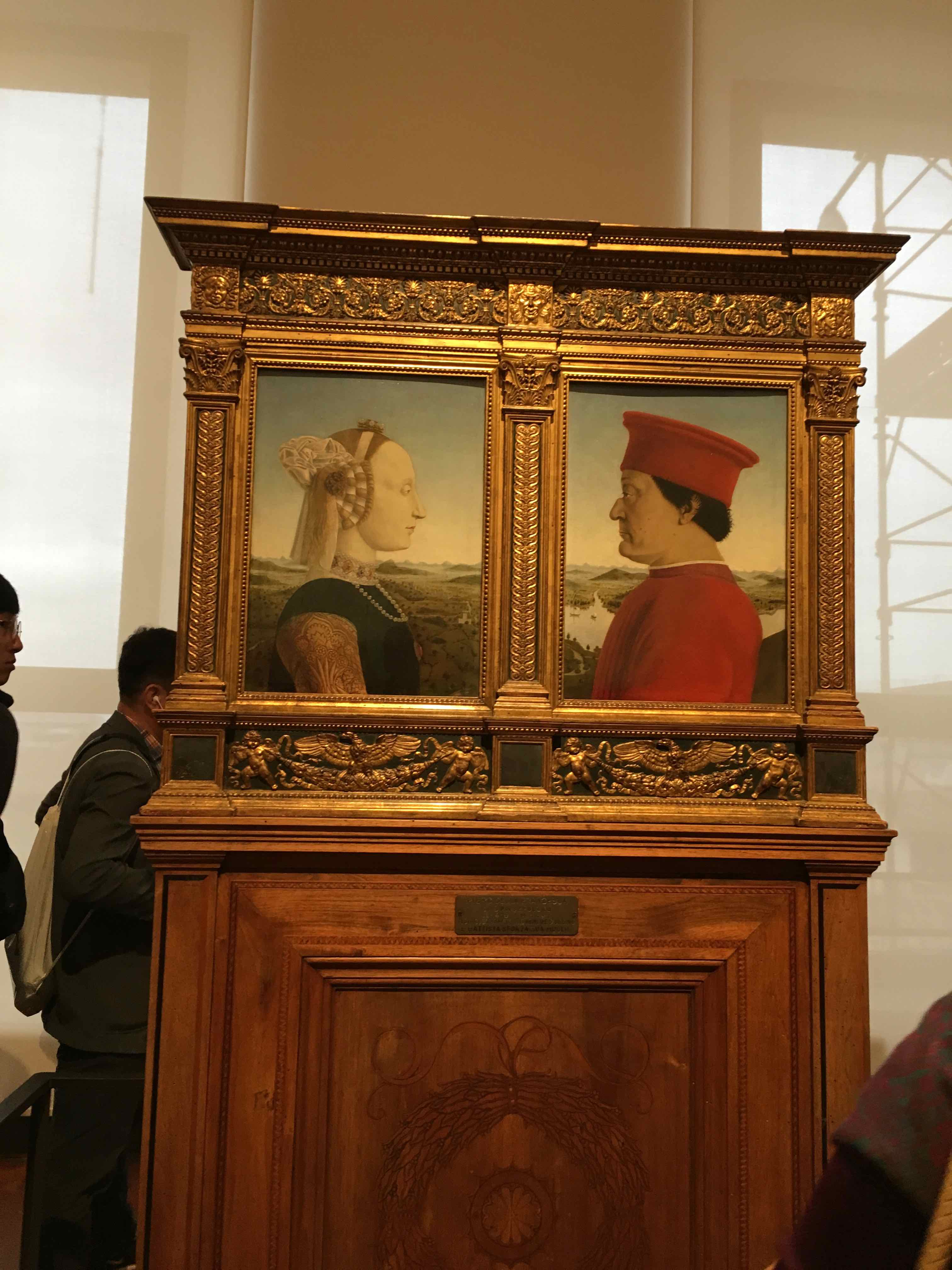 피에로 델라 프란체스카(PIERO DELLA FRAMCESCA)의 <페데리코 다 몬테펠트로와 바티스타 스포르차(Portraits of Federico da Montefeltro and Battista Sforza, 1465-1466)>다. 이 작품은 이탈리아 르네상스 초상화에 풍경이 배경으로 등장하는 초기작이다. 오른쪽 남자는 우르비노의 강력한 통치자 '페데리코 다 몬테펠트로'이고, 왼쪽의 여자는 그의 아내 '바티스타 스포르차'이다. 각각 측면을 그려서 서로 마주보는 것 처럼 풍경이 이어지는 구도가 참 인상적이다. 이유가 있는데 '페데리코 다 몬테펠트로'는 마상시합 중 오른쪽 얼굴과 코를 심하게 다쳤기 때문에 이를 가리기 위해 '페데리코 다 몬테펠트로'의 초상은 왼쪽 측면만을 그린 것이다. 그리고, '바티스타 스포르차'의 초상은 오른쪽 측면을 그려 서로 마주보는 한편의 초상화를 완성시켰다. '바티스타 스포르차'는 14세에 페데리코와 결혼하여 11년간 8명의 딸을 낳았고, 마지막으로 아들을 낳고 6개월 후 폐렴으로 세상을 떠났다. 화가는 '페데리코 다 몬테펠트로'가 그의 아내를 추모하기 위해 주문한 그림을 그리기 위해 '바티스타 스포르차'의 데스마스크를 보고 그렸기에 그녀의 얼굴이 창백한 것을 확인할 수 있다.