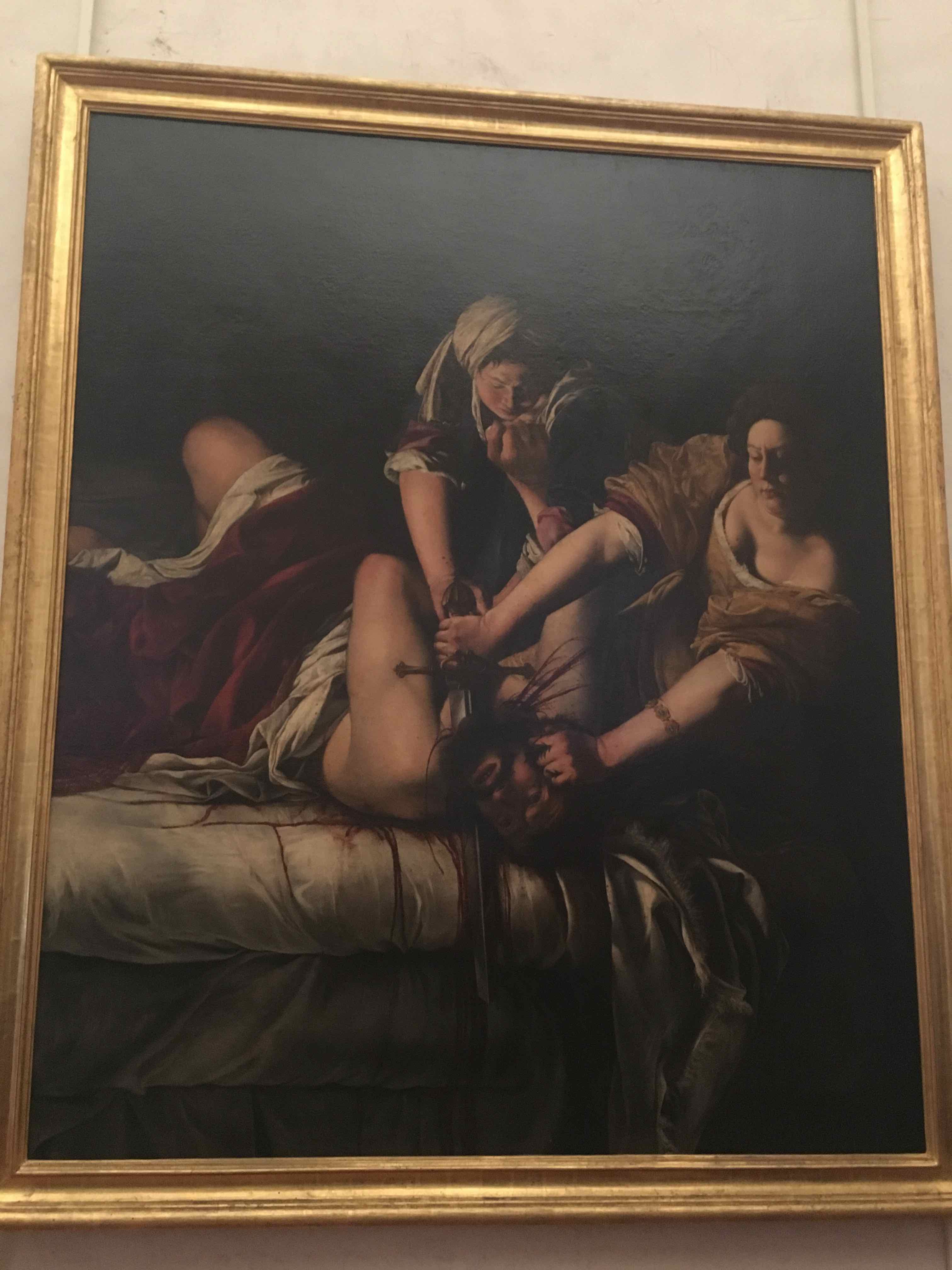 아르테미시아 젠틸레스키(Artemisia Gentileschi, 1593-1652)의 <홀로페르네스의 목을 자르는 유디트(Judith Slaying Holofernes, 1614-20)>다. 항상 "카라바조(Michelangelo da Caravaggio)의 유디트와 홀로페르네스"와 비교되는 작품이다.