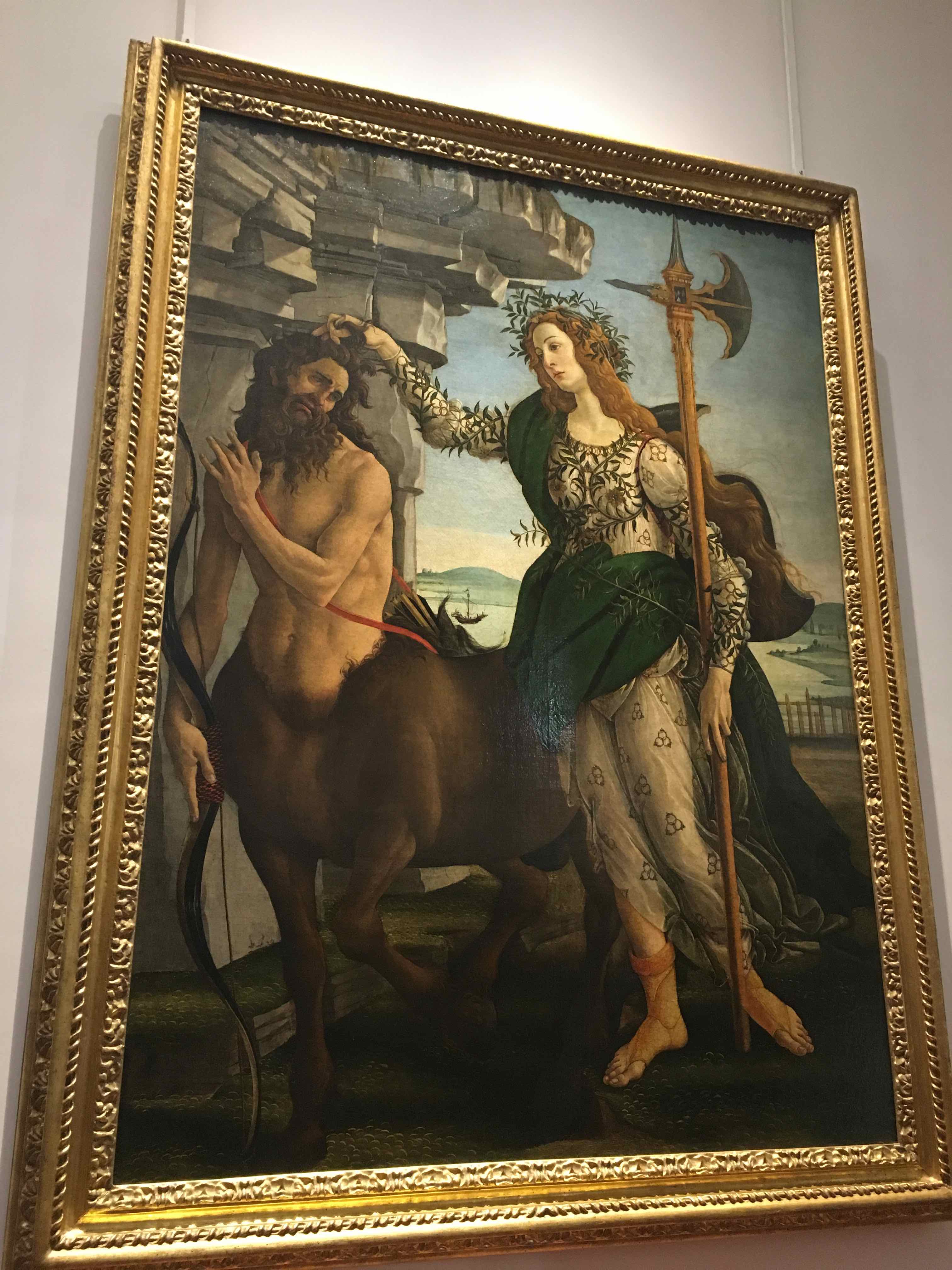 산드로 보티첼리(Sandro Botticelli, 1445-1510)의 <팔라스와 켄타우로스(Pallade e il Centauro, 1482)>다. 메디치 가의 요청으로 보티첼리가 그린 작품이다. 메디치 가를 상징하는 세개의 원이 교차되어 있는 무늬가 그려진 흰색 가운을 입고 올리브 잎으로 한껏 장식을 한 여인이 방패를 등에 메고 미늘 창(Halberd)을 들고 있고, 여신 앞에 있는 무지의 상징인 켄타우르스의 머리카락을 한 손으로 웅켜쥐고 있는 모습이 그려져 있다. 여기서 이 여인은 "지혜와 전쟁의 여신, 팔라스 아테네(Pallas Athena)"다. 지혜와 전쟁의 여신은 이성을 상징하는데, 이 작품이 "로렌조 디 메디치(Lorenzo de Medici)의 침실"에 있었다는 것을 근거로 금욕을 의미하는 작품으로 해석된다.