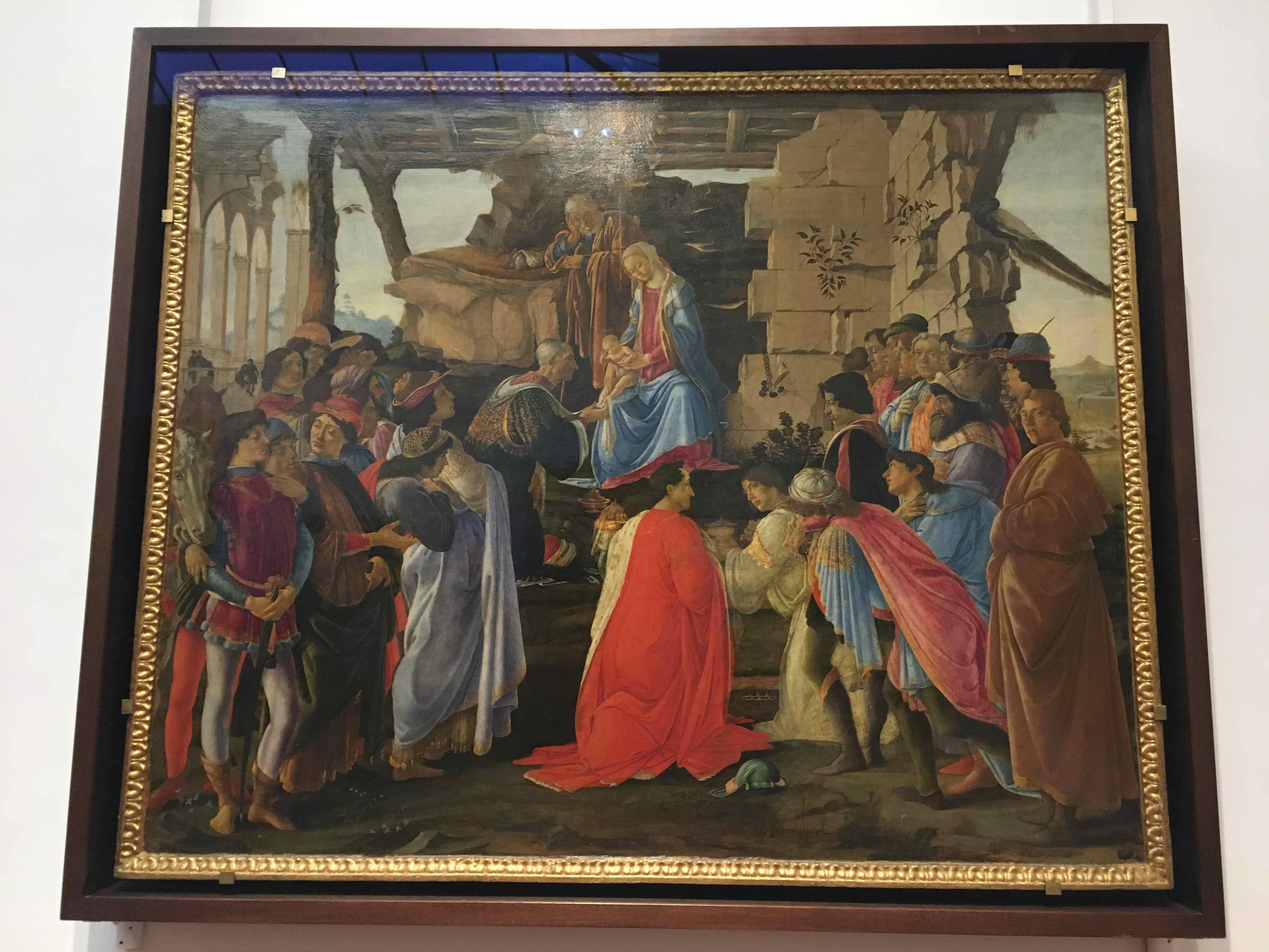 산드로 보티첼리(Sandro Botticelli, 1445-1510)의 <동방박사의 경배(Adorazione dei Magi, 1475)>다. 신약성사의 마태오 복음서 제 2장 1-11절, "헤롯 왕 때에 예수께서 유대 베드레헴에서 나시매 동방으로부터 박사들이 예루살렘에 이르러 말하되, 유대인의 왕으로 나신 이가 어디 계시뇨, 우리가 동방에서 그의 별을 보고 그에게 경배하러 왔도라 하니.. 집에 들어가 아기와 그 모친 마리아가 함께 있는 것을 보고 엎드려 아기께 경배하고, 보배합을 열어 황금과 유향과 몰약을 예물로 드리니라."
